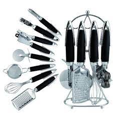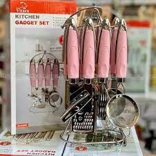 رنگ استیل-8پارچه شامل همزن-چاقوتیزکن-پوست کن-دربازکن-پیتزا بر-رنده-صافی چای-استند